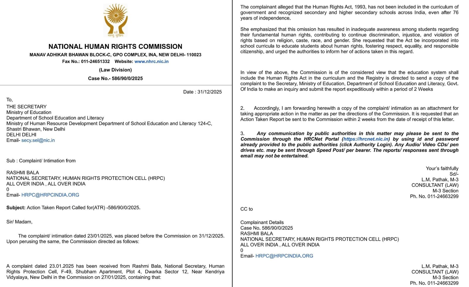 स्कूली पाठ्यक्रमों में मानवाधिकार संरक्षण अधिनियम 1993 की अनुपस्थिति पर HRPC का सख्त रुख: राष्ट्रीय मानवाधिकार आयोग ने स्कूल शिक्षा और साक्षरता विभाग भारत सरकार से दो सप्ताह में रिपोर्ट मांगी